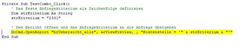 DoCmd.OpenReport "brUebersicht_alle", acViewPreview, , "Kostenstelle = 2331"
