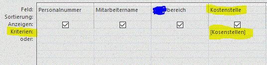 ich habe eine Abfrage erstellt mit Abfragekriterien. Nun möchte ich mit Hilfe der Abfragekriterien meinen Bericht filtern. Ich möchte in diesem Fall meine Mitarbeiter anhand Kostenstellennummern filtern.